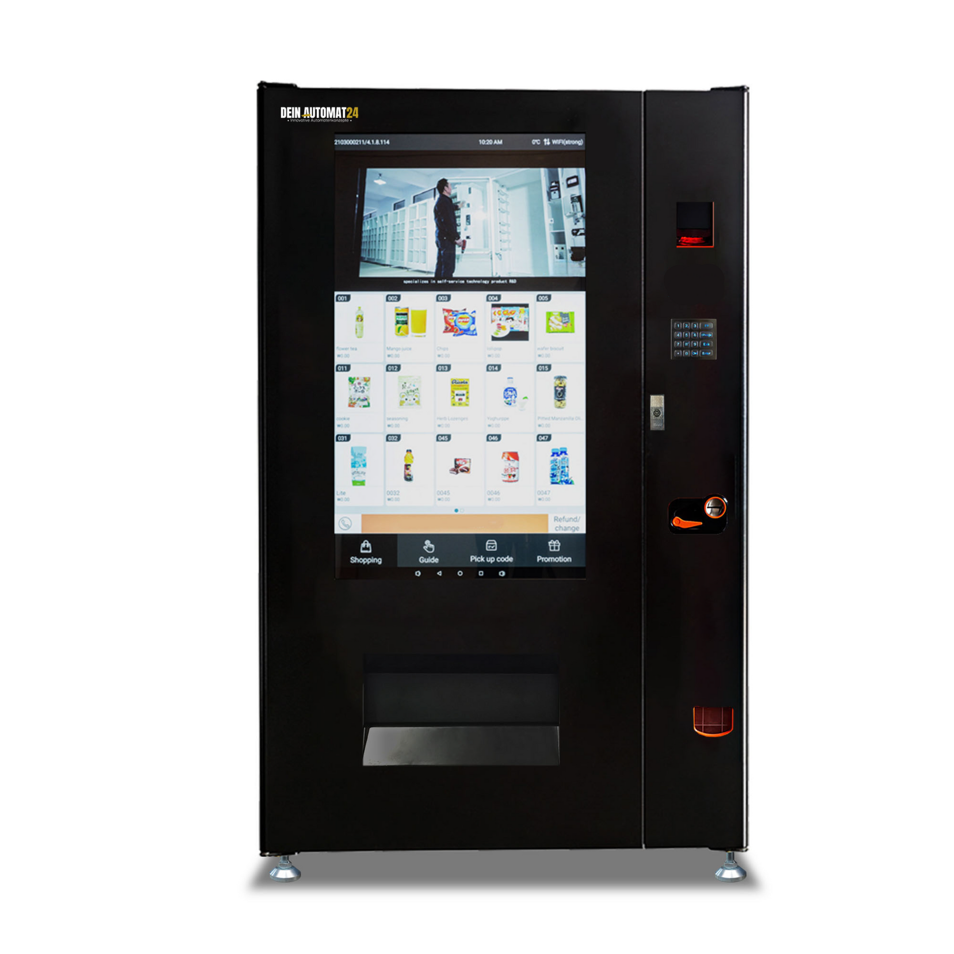 Dieser Automat setzt neue Maßstäbe in Design, Interaktivität und Bedienkomfort. Mit seinem riesigen 49-Zoll-Full-Touch-Display bietet er ein modernes, digitales Einkaufserlebnis, bei dem Kunden alle Produkte direkt über den Bildschirm auswählen können. Perfekt für auffällige Standorte, bei denen Präsentation, Werbung und einfache Bedienung im Vordergrund stehen. Dank unserer eigenen DA24-Software lassen sich Spiralen und Förderbänder frei kombinieren und bis zu fünf Ebenen gleichzeitig ansteuern – ganz ohne Umbauten oder Motortausch. Zusätzlich kann der Automat als Master bis zu drei weitere Slaves steuern – und das mit nur einem einzigen Zahlungssystem.